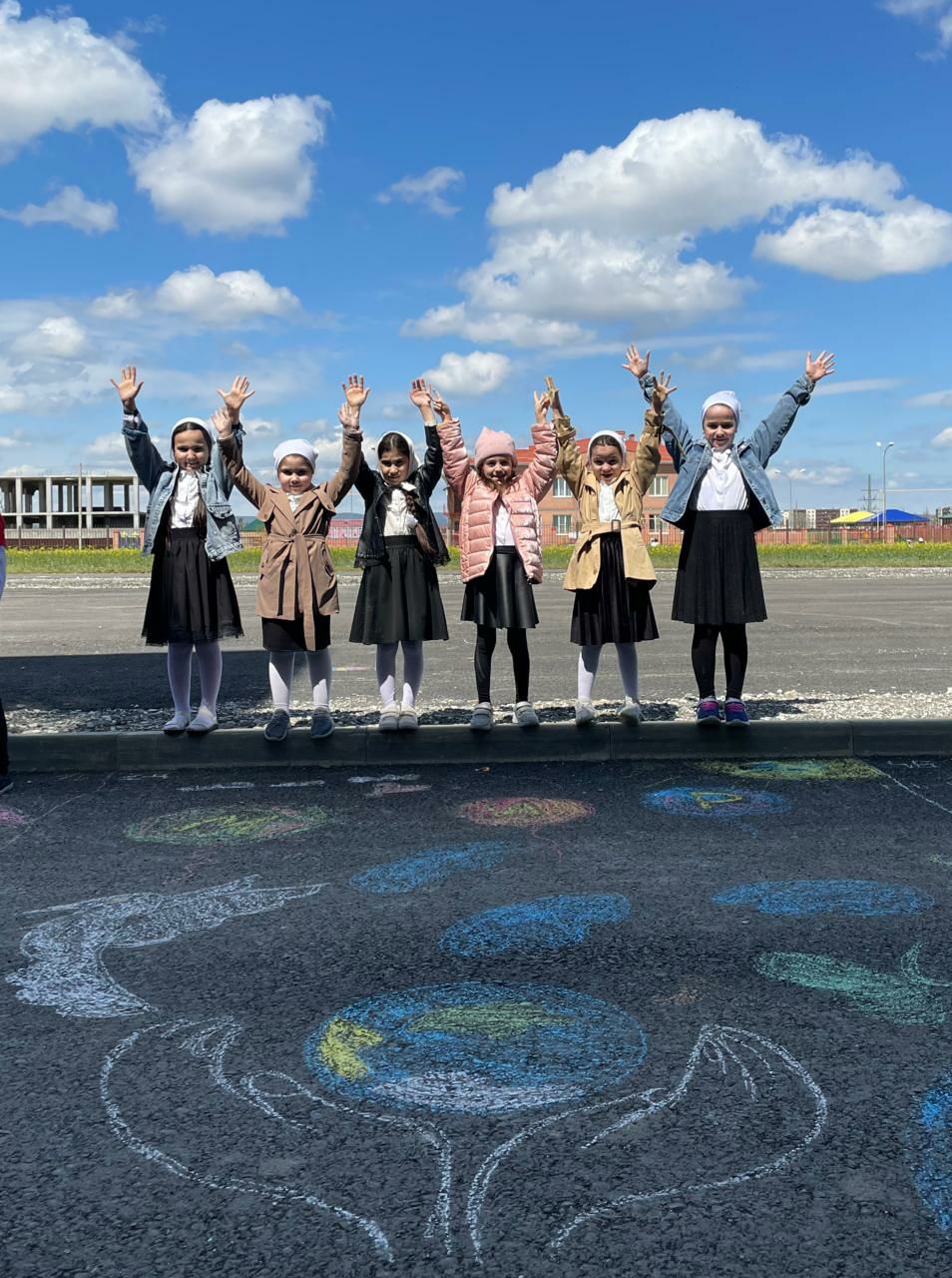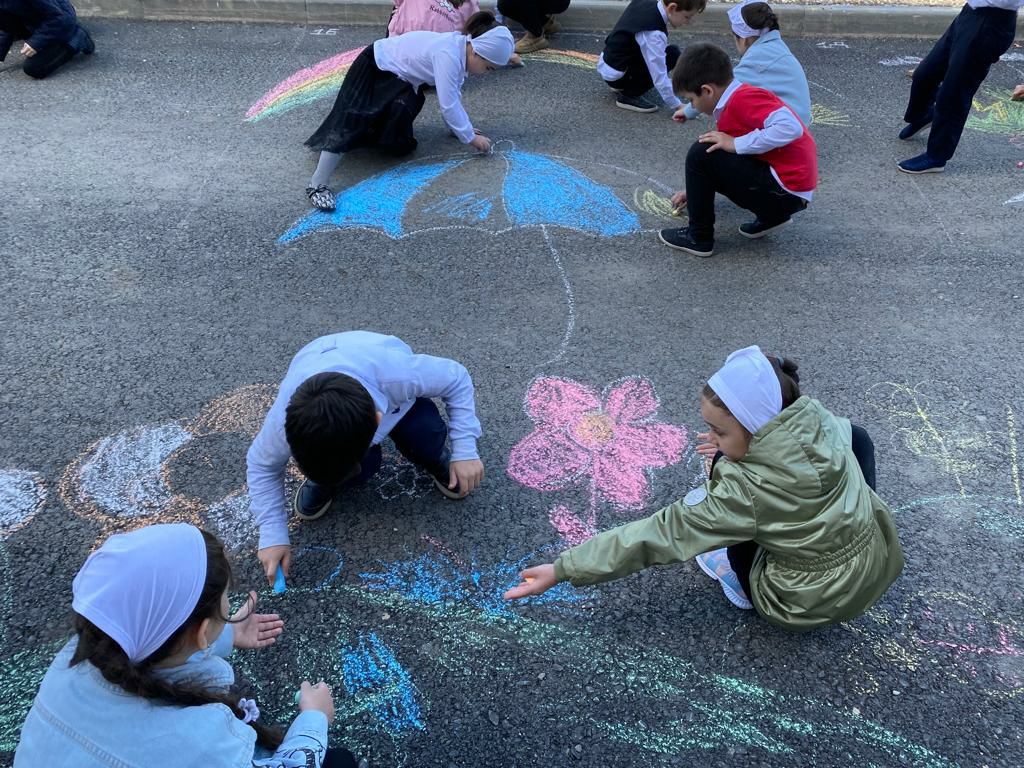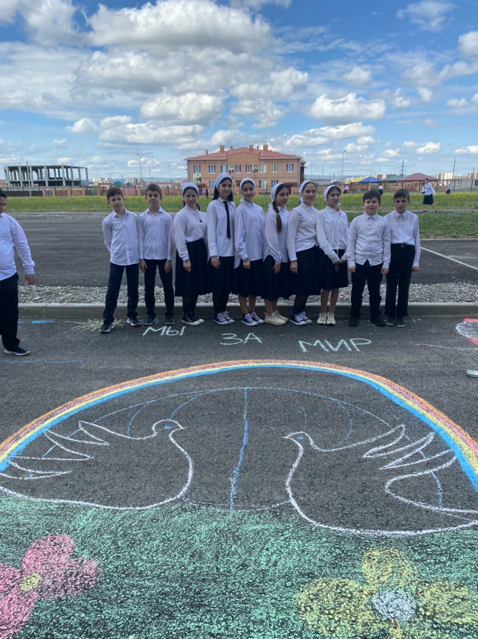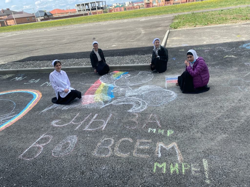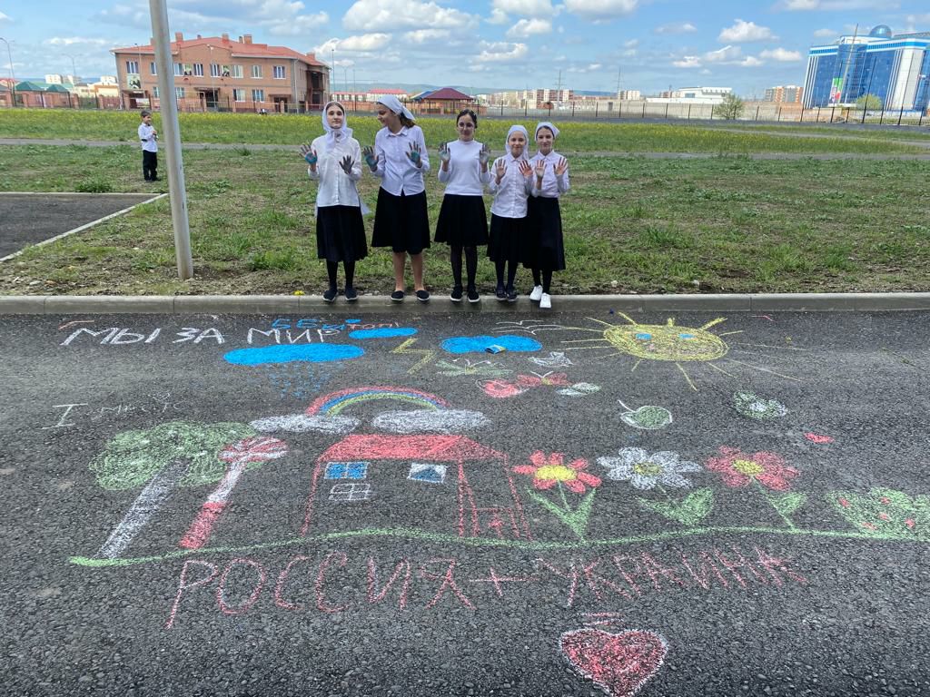 15.04.2022В канун Дня мира во дворе школы прошел конкурс детских рисунков на асфальте, посвященных Дню мира в Чеченской Республике.Для того чтобы рассказать о своих ассоциациях, связанных с этим добрым весенним праздником, собрались обучающиеся 2-6 классов. Так же изъявили поучаствовать и наши первоклашки. Маленькие художники разноцветными мелками на асфальте выразили свою любовь к Родине, республике, попытались показать всю красоту мира. Практический каждый рисунок дополнялся девизом: «Миру - мир», «Мир – дело всех и каждого» и другими.Все дети с большим удовольствием взялись за работу, было видно, что они очень стараются.
