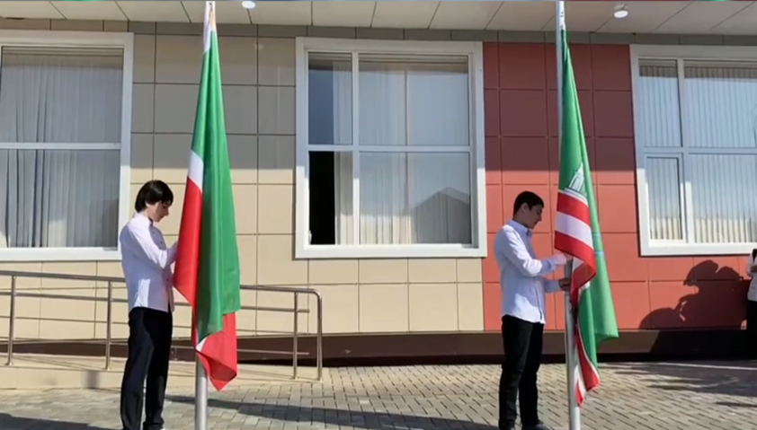 торжественная линейка с поднятием флагов и исполнением гимнов РФ, ЧР