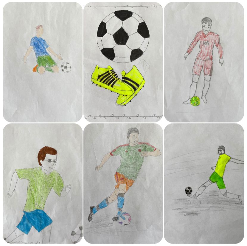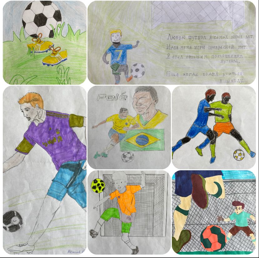 Работ было много, более 20 рисунков, выделены 5 лучших. В творческих работах учащихся были изображены футболисты, футбольные поля, зарисовки футбольных баталий.