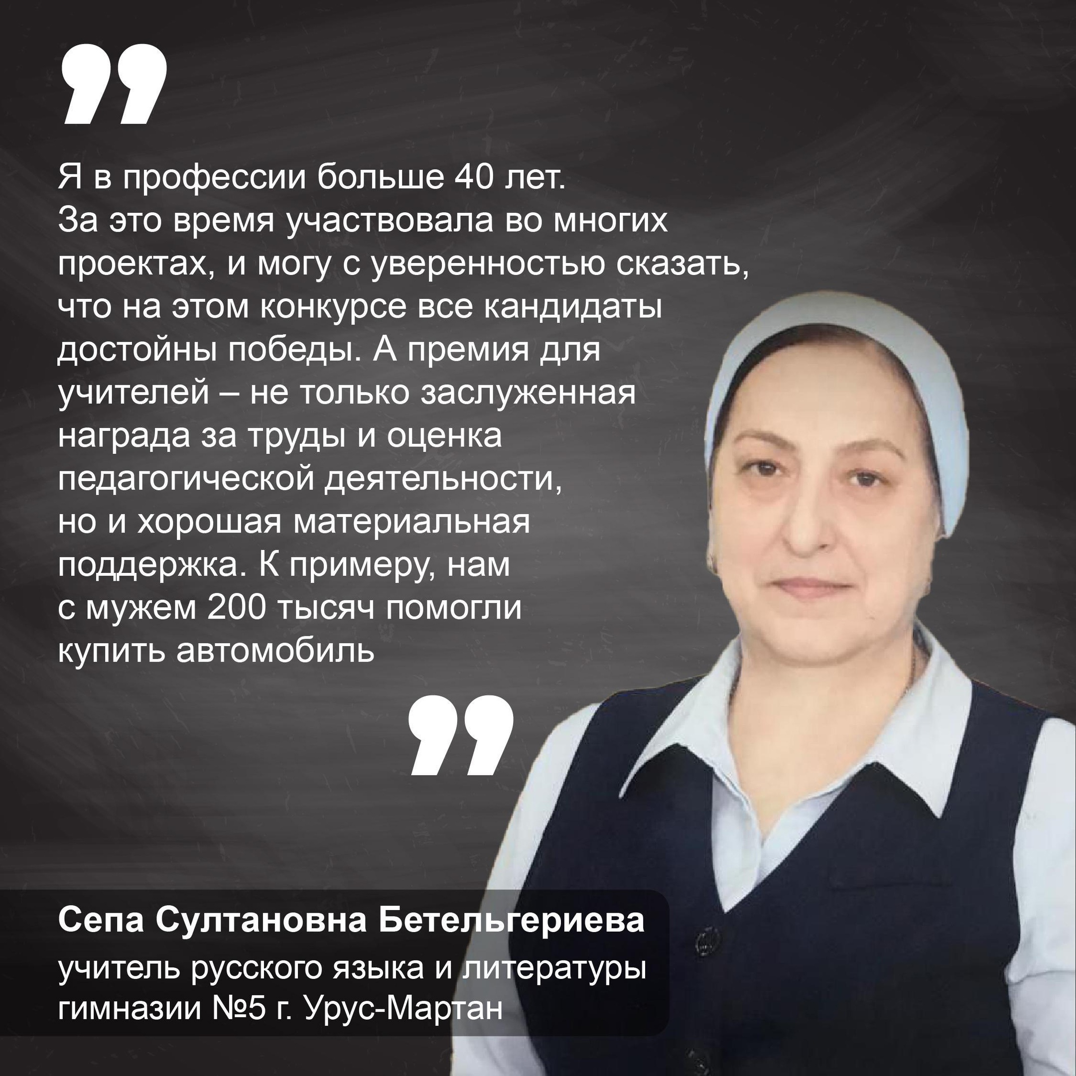 По словам учителя русского языка и литературы школы №5 г. Урус-Мартан Сепы Бетельгериевой, конкурсный отбор проводится очень тщательно и состоит из нескольких этапов.«Я в профессии больше 40 лет. За это время участвовала во многих проектах, и могу с уверенностью сказать, что на этом конкурсе все кандидаты достойны победы. А премия для учителей – не только заслуженная награда за труды и оценка педагогической деятельности, но и хорошая материальная поддержка. К примеру, нам с мужем 200 тысяч помогли купить автомобиль», – рассказала Сепа Султановна.Работа ведется по поручению Президента РФ Владимира Путина, который объявил 2023 год Годом педагога и наставника.
