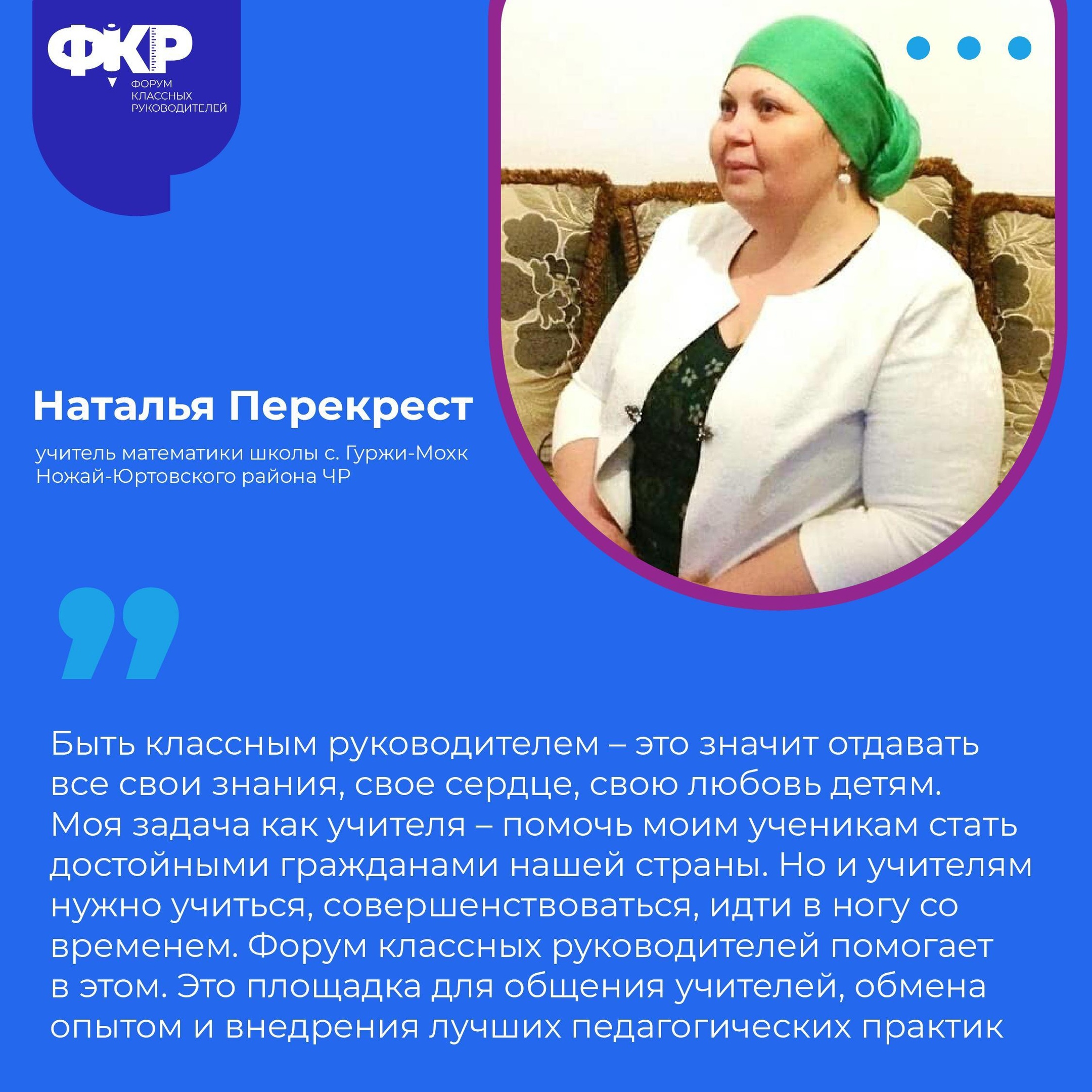 В прошлом году Чеченская Республика делегировала на форум наибольшее количество классных руководителей. По словам участницы ФКР-2022 учителя математики школы с. Гуржи-Мохк Ножай-Юртовского района Натальи Перекрест, форум помогает учителям пробовать новые методики преподавания, внедрять интересные и интерактивные форматы в обучение. Педагог отметила, что уже прошла регистрацию на ФКР-2023.