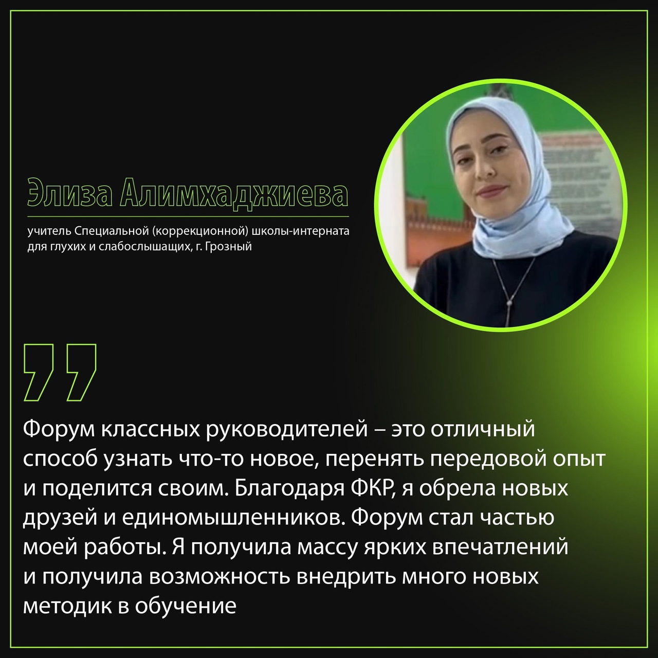 Элиза Алимхаджиева работает в не совсем обычной школе. Работать с детьми с нарушениями слуха непросто, еще сложнее внедрять какие-то новые форматы в обучение. После знакомства с ФКР и его участниками она ввела много новых методик в свою педагогическую деятельность.