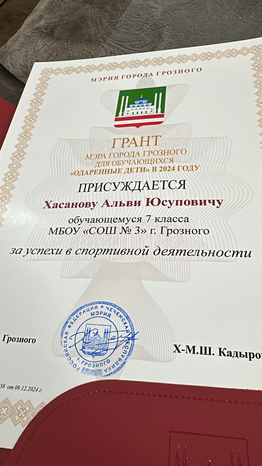 28.12.2024Мы рады сообщить, что наш талантливый ученик 8-в класса, Альви Хасанов, получил грант Мэра города Грозного за его выдающиеся достижения в спорте!